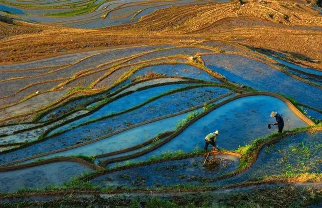 层层叠叠、错落有致的梯田、山峦、日月、云雾交相辉映,形成一幅气势磅礴的山水画卷。如今,这幅画卷已成为云鹤最美的名片。